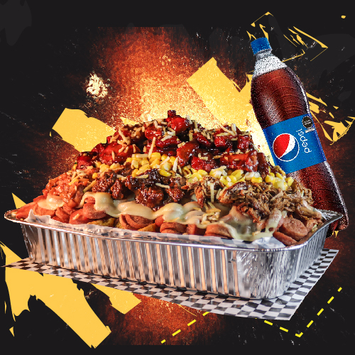 La Explosiva*1 (Para 5 con Costilla ahumada con salsa bbq,burger meat artesanal x2, tocineta ahumada premium x2, pollo desmechado x2, maicito tierno x2, queso, ripio y salsas de la casa, salchicha + Gaseosa 1.5 Gratis.)
