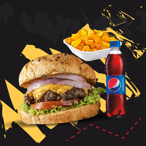 Hamburguesa angus artesanal, porción papa criolla y gaseosa 400ml.