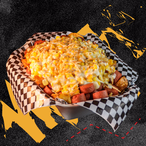 Salchicha Ranchera, Maicito, Queso Gratinado, Ripio de papa, Salsa Casera