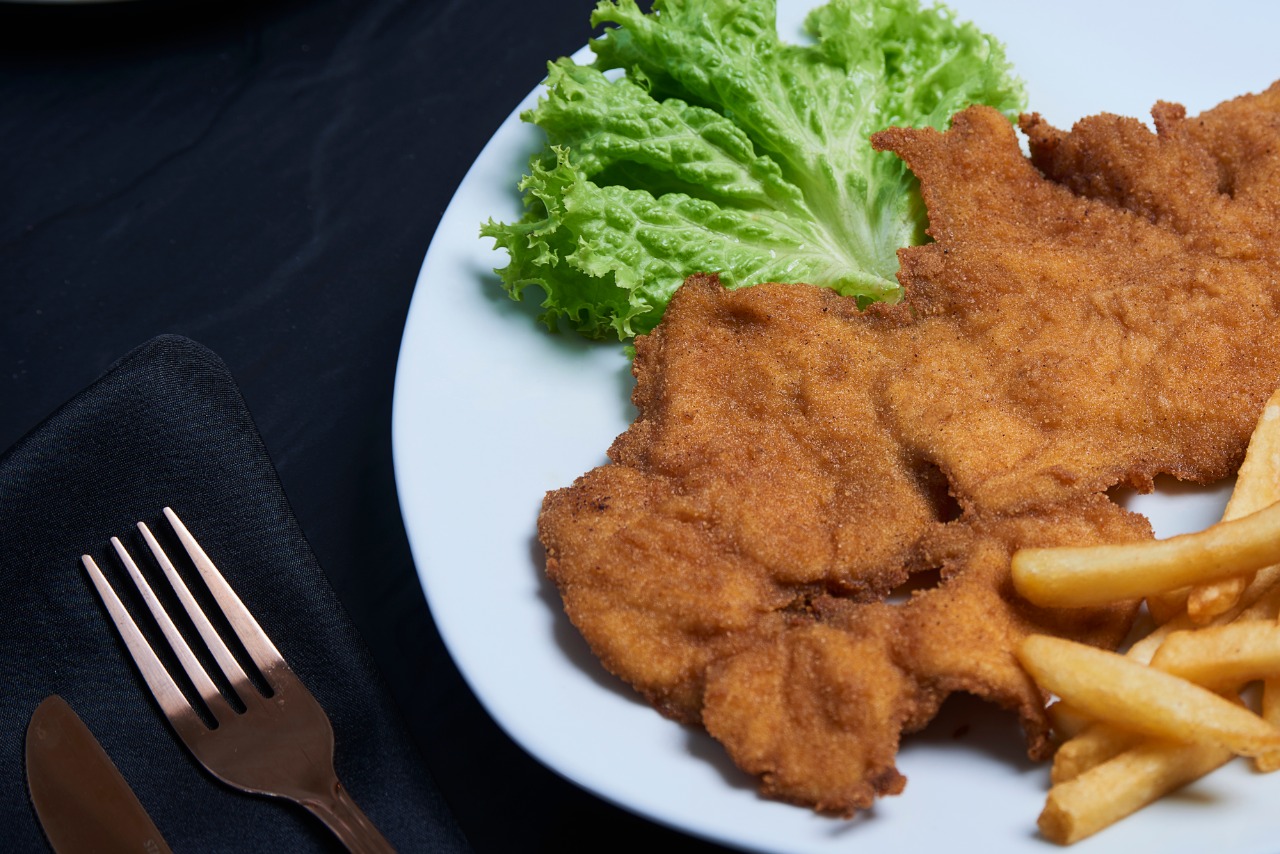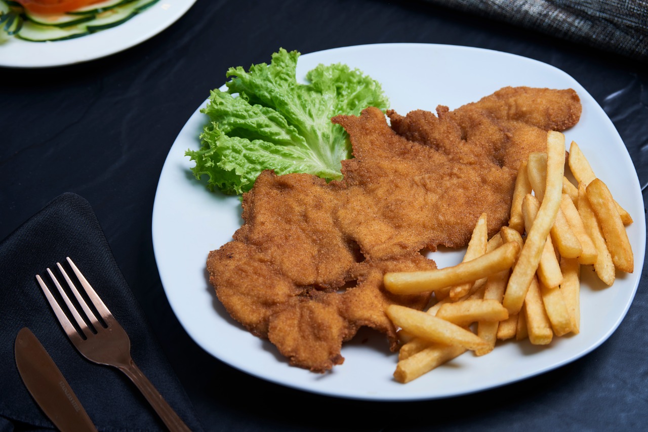 Chuleta de cerdo 280 gramos, acompañado de arroz blanco ( porción de icopor), ensalada del día y papas a la francesa ( 100 gramos)