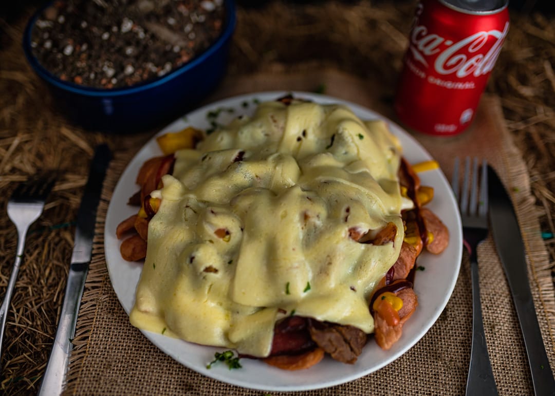 Salchicha, carne de hamburguesa, cabano, chorizo, papas a la francesa, papa amarilla, queso, tocineta y salsas