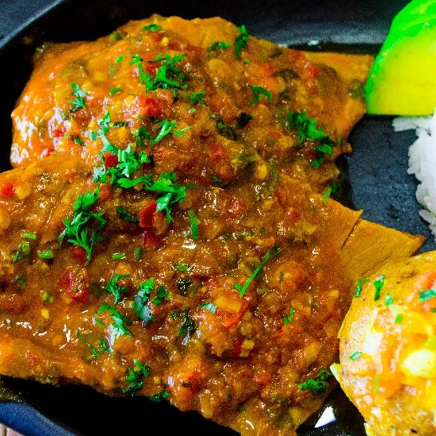 Acompañado de papa cocinada, arroz blanco y salsa criolla