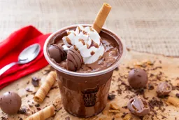 Malteada de chocolate, chocolatina Jet, crema de avellanas, barquillo, salsa de chocolate, chantillí.