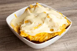 Nachos, queso cheddar, queso mozzarella, salsa ranch, carne o pollo desmechado a elección y pico de gallo.
