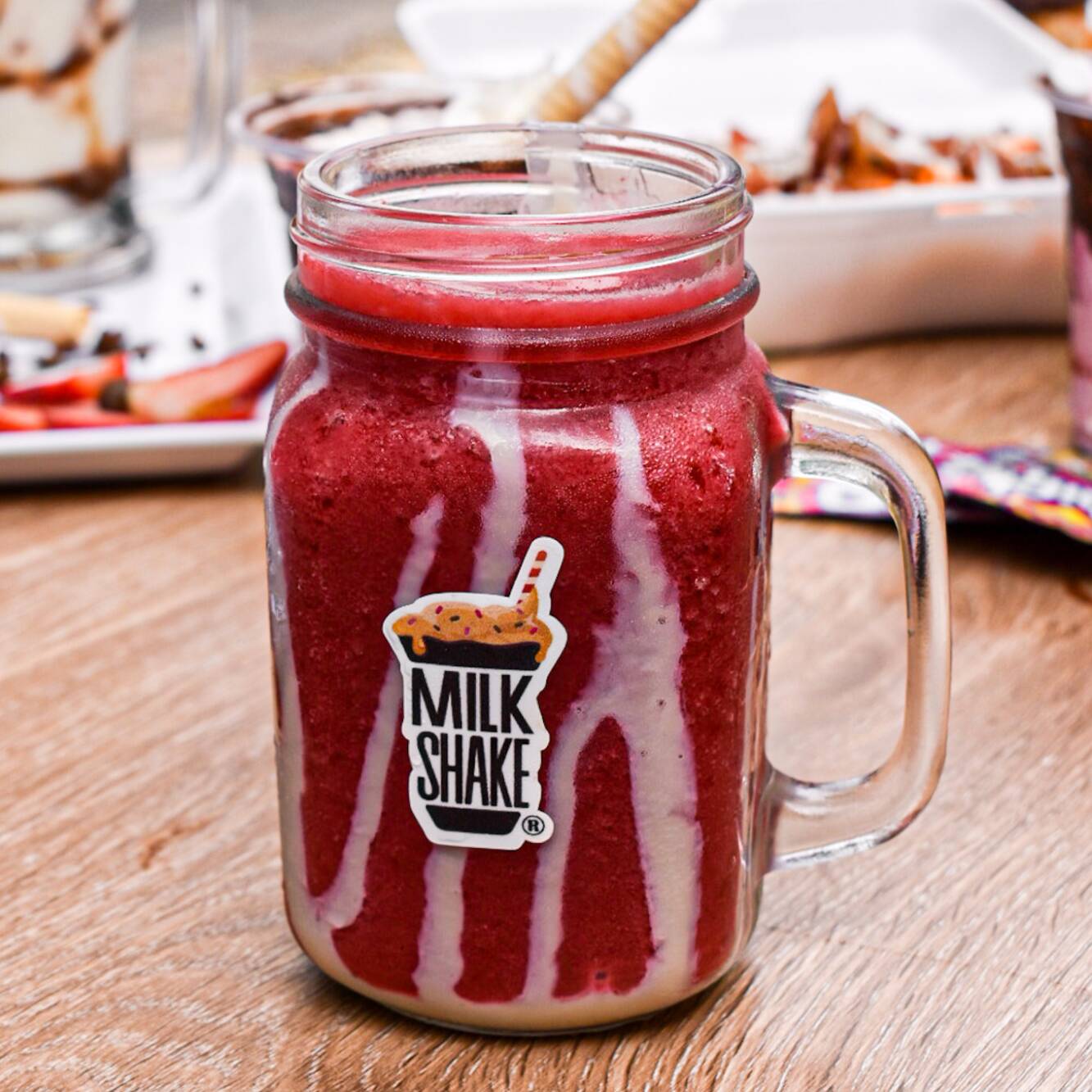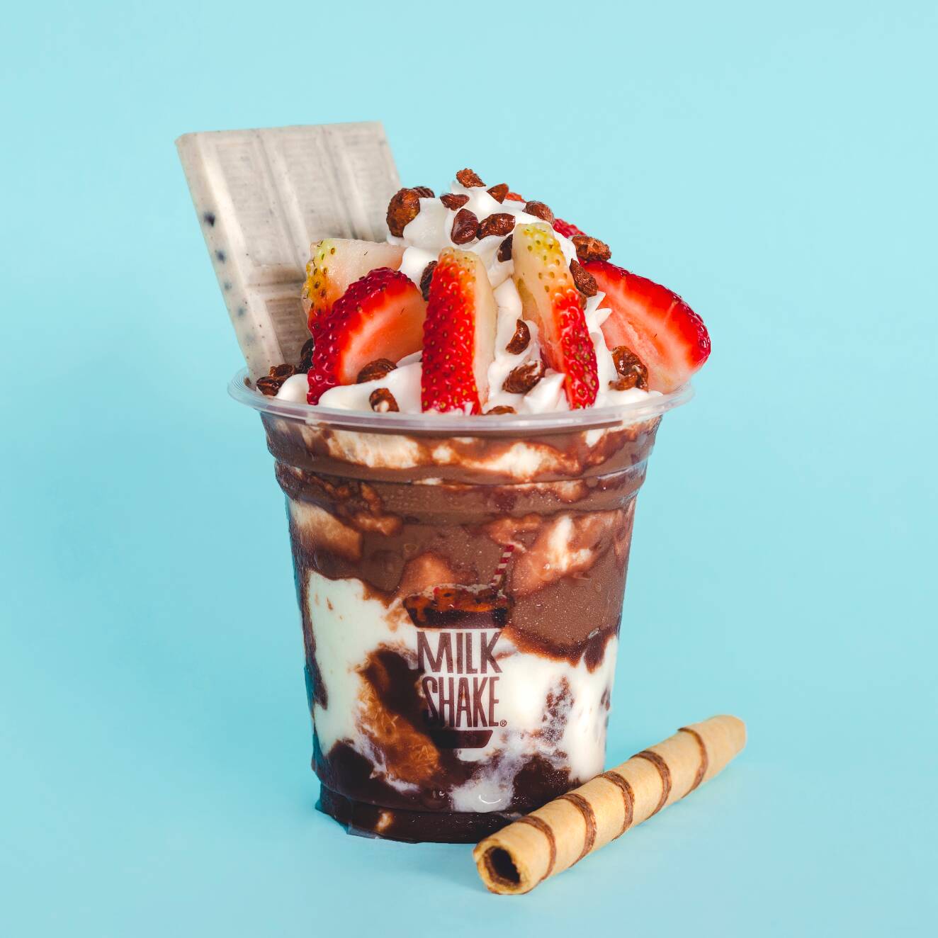 Malteada de fresa, crema de avellanas, Sparkies, masmelos mini, moritas, barquillo, salsa de fresa, chantillí.