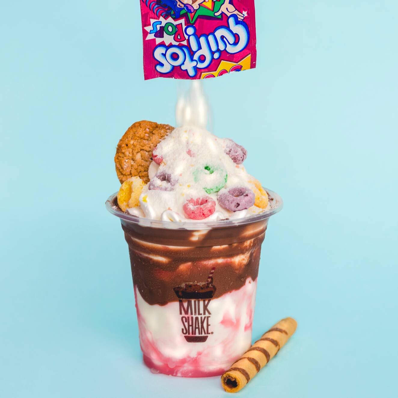 Malteada de vainilla, Quipitos, crema de avellanas, Froot Loops, galleta de fresa, barquillo, salsa de fresa, chantillí.