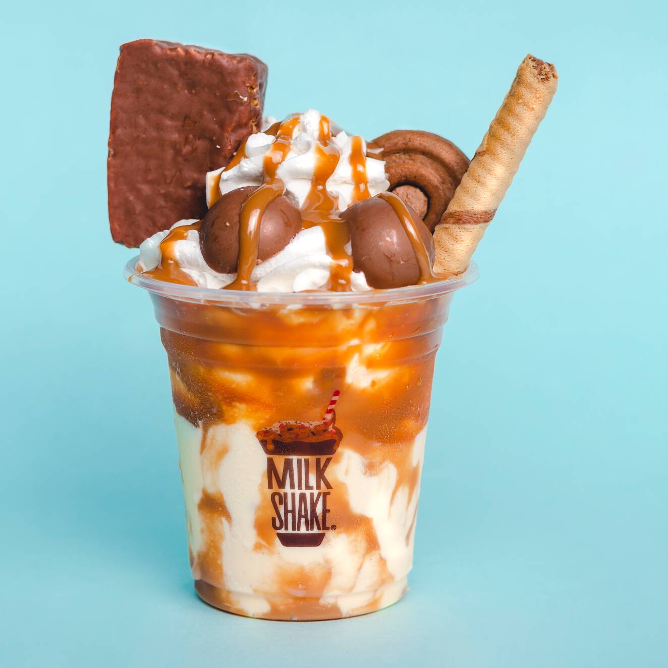 Malteada de Milo, crema de avellanas, galleta Milo, chocolatina Jet, Milo, barquillo, salsa de chocolate, chantillí.