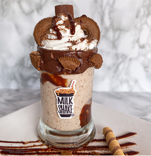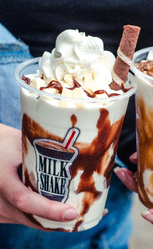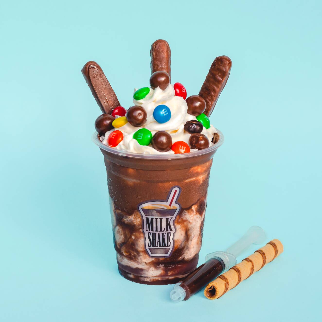 Malteada de brownie, crema de avellanas, m&m chocolate, deditos Nestlé, Chokis bolitas, grageas de colores, barquillo, jeringa de chocolate, salsa de chocolate, chantillí.