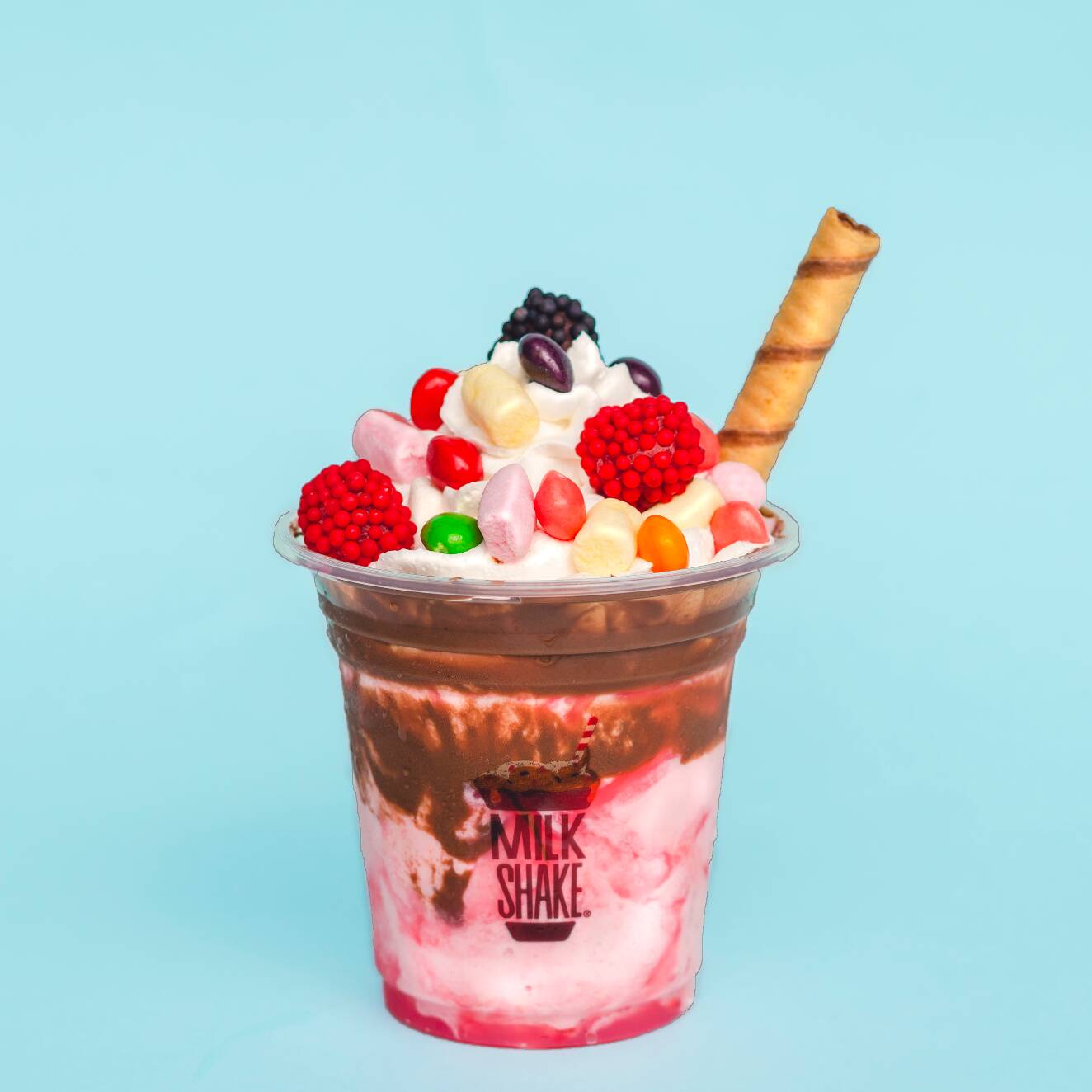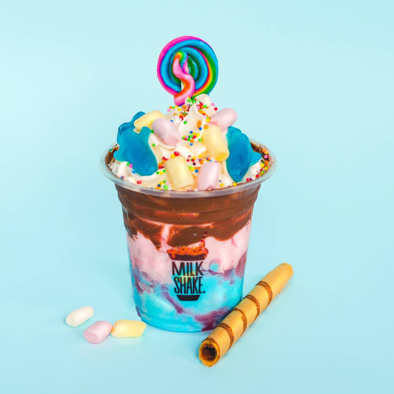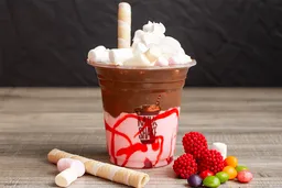Malteada de chicle y fresa, crema de avellanas, millows, gomas Trululu feroz, paleta, grageas de colores, barquillo, salsa de fresa, chantillí.