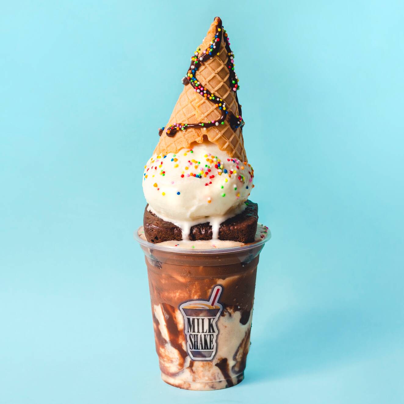 Malteada de vainilla, crema de avellanas, cono a elección, brownie, grageas de colores, barquillo, salsa de chocolate, chantillí.