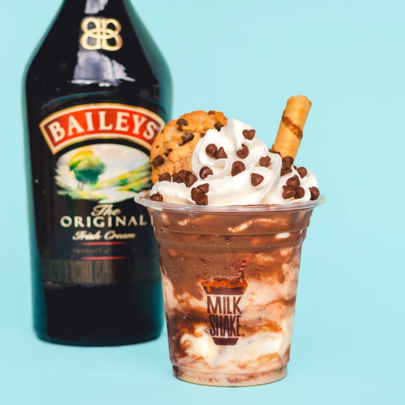 Malteada de Baileys, crema de avellanas, Baileys, galleta Chokis, chips de chocolate, barquillo, salsa de chocolate, chantillí.