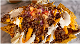 Nachos, queso cheddar, queso mozzarella, salsa ranch, carne desmechada, pollo desmechado y pico de gallo.