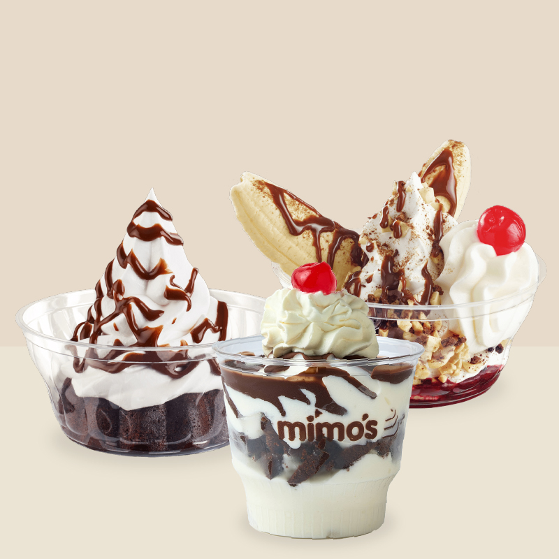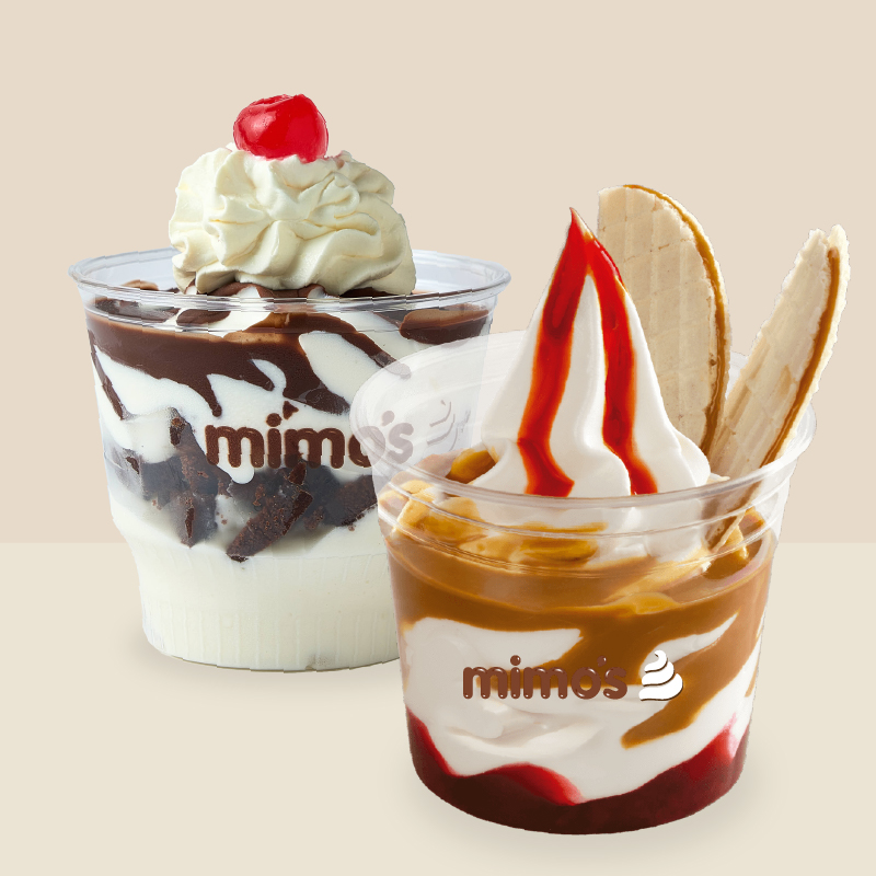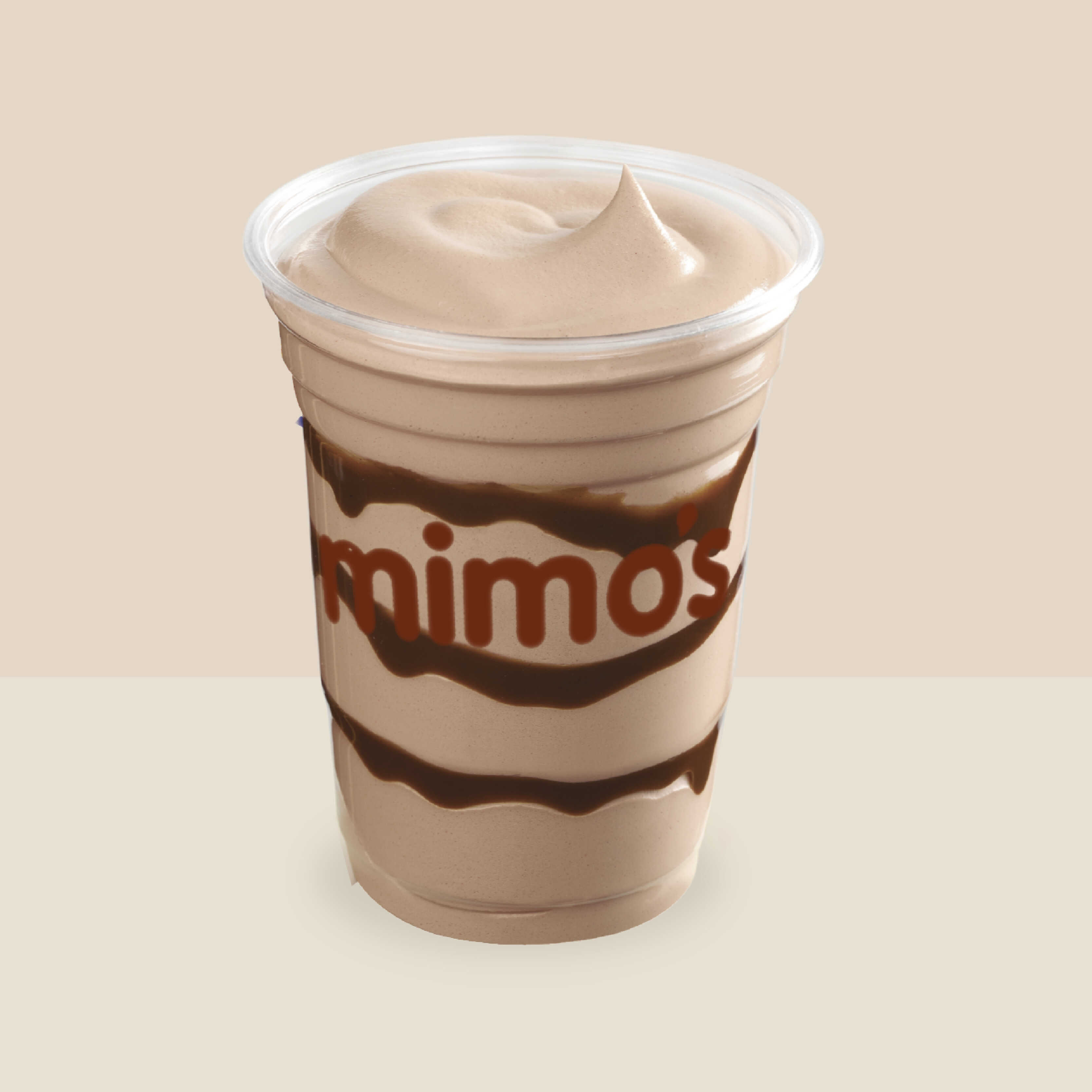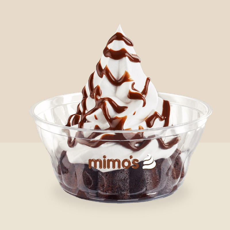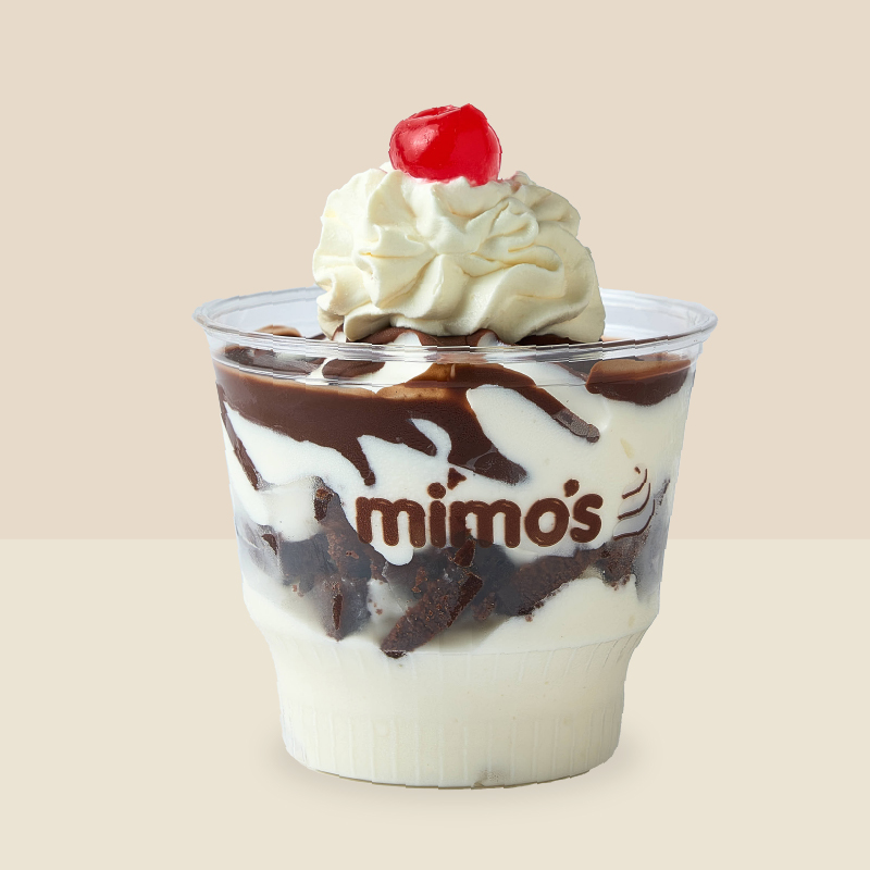 Helado suave de vainilla, trocitos de brownie, chocolate mimos, chantilly y cereza, la consistencia de la cobertura de chocolate mimo's(caliente)puede variar a temperatura ambiente.