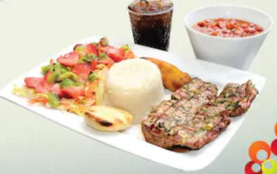 Acompañada de carne, pollo, lomo de cerdo, costilla ahumada bbq, chorizo, ensalada, maduro gratinado, arroz, bebida y postre