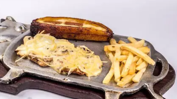 Filete de pollo 120 gr con champiñones acompañados de papas a la francesa, maduro gratinado y ensalada de aguacate. obsequio bebida.