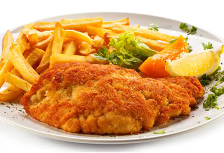Filete de Pechuga acompañada de papas a la francesa, ensalada, maduro gratinado. Obsequio bebida y postre