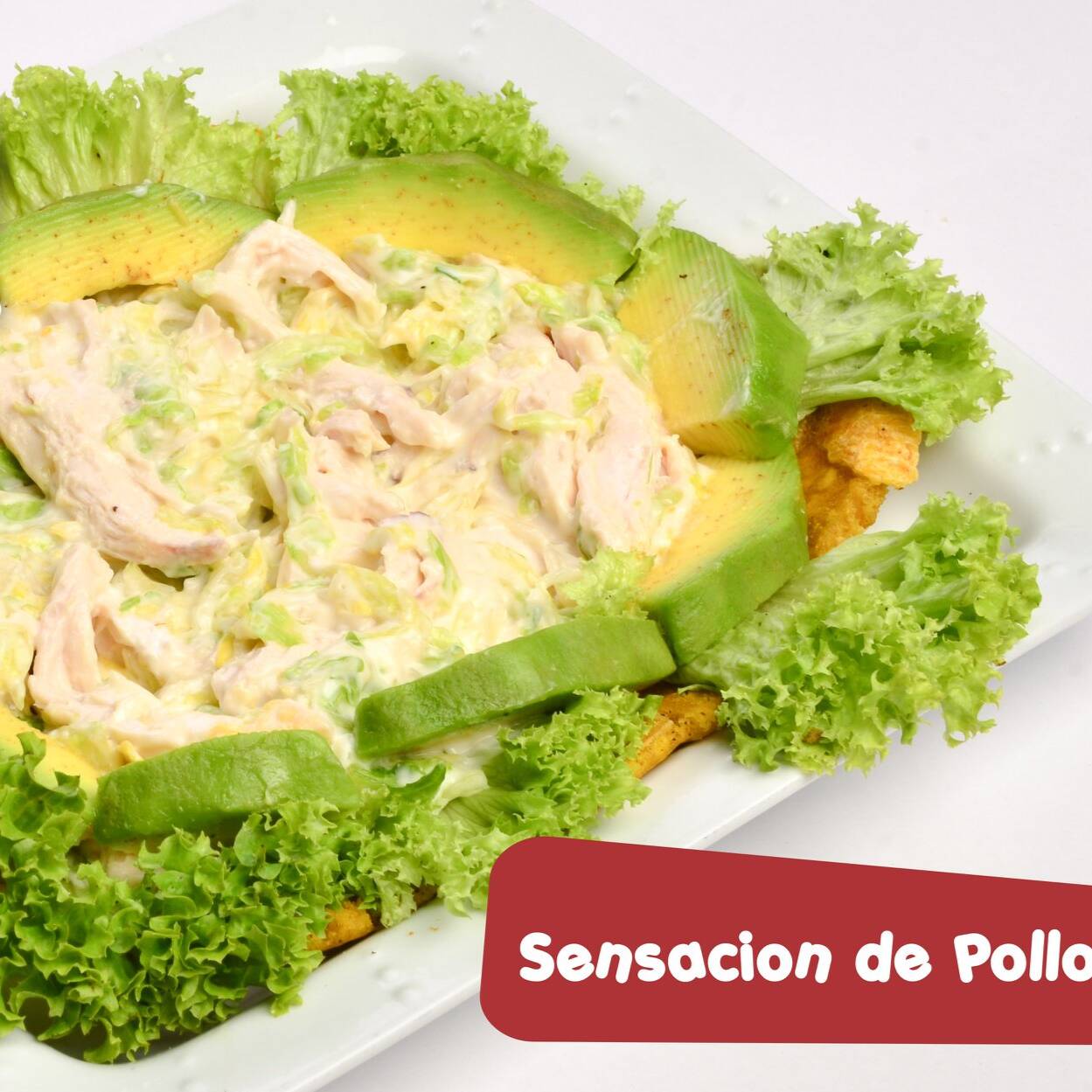 Pollo desmechado, lechuga batavia en julianas, mayonesa y aguacate. OBSEQUIO bebida y postre