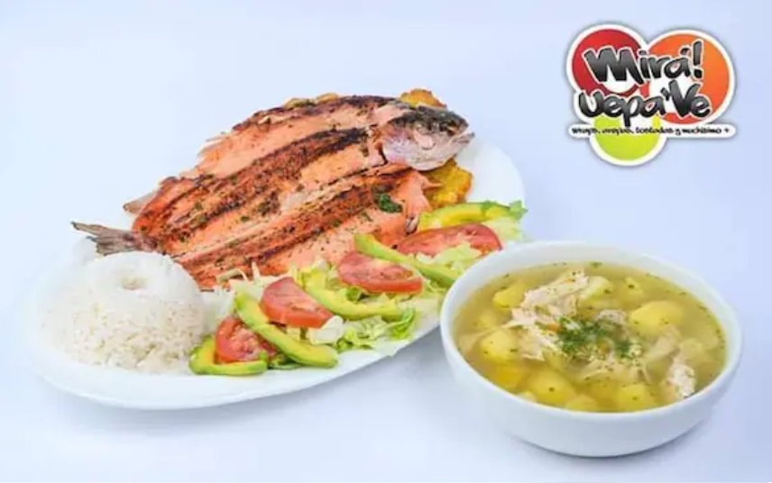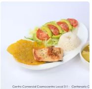 Chuleta de pescado 150 gr acompañado de ensalada verde (lechuga batavia, zanahoria, tomate, aguacate), arroz, patacón, sopa del día, bebida (Obsequio Postre)