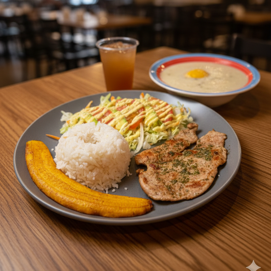 Delicioso Almuerzo Ejecutivo del Día acompañado de un Lomo de Cerdo, arroz, ensalada, tajada, sopa del día de 12 onz y una deliciosa bebida de la casa.