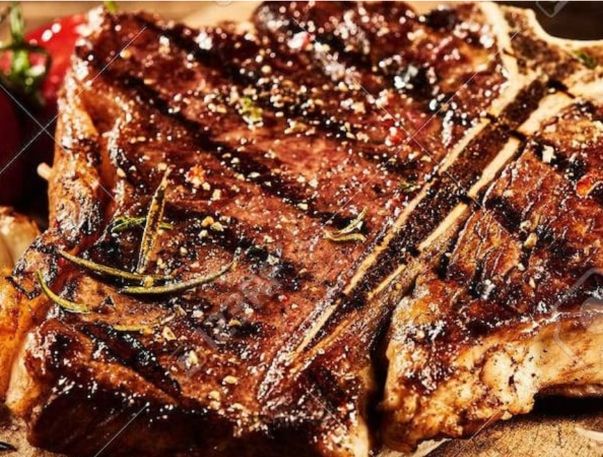 Costilla Ahumada 300 gr, Acompañado: Papas francesas, Maduro gratinado, Ensalada verde con aguacate + Bebida.