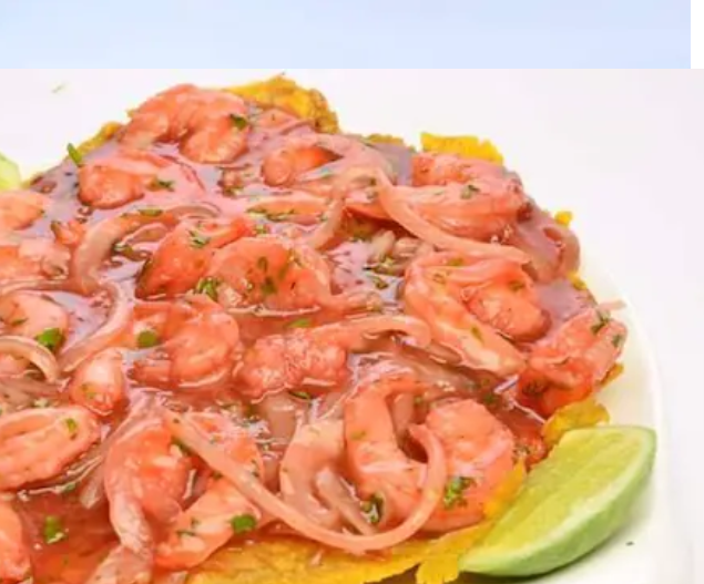 Ceviche, 200 grs de camarones con tostada de platano + bebida.