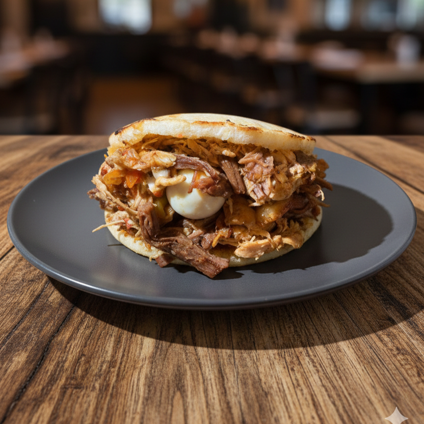Deliciosa Arepa con Todo acompañada de Carne desmechada, pollo desmechado, chicharrón crocante, queso y un huevo de codorniz.