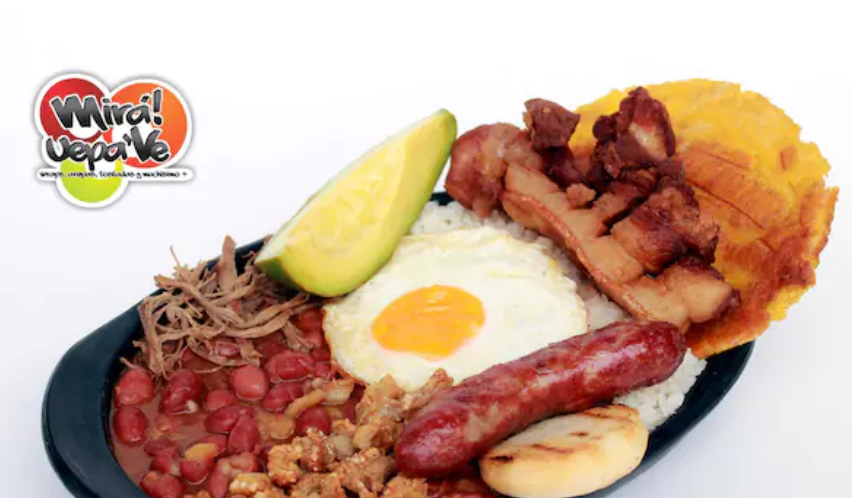 Frijoles con Chicharrón crocante, carne molina, arroz, patacón, aguacate, huevo, chicharrón carnudo, chorizo santarrosano.