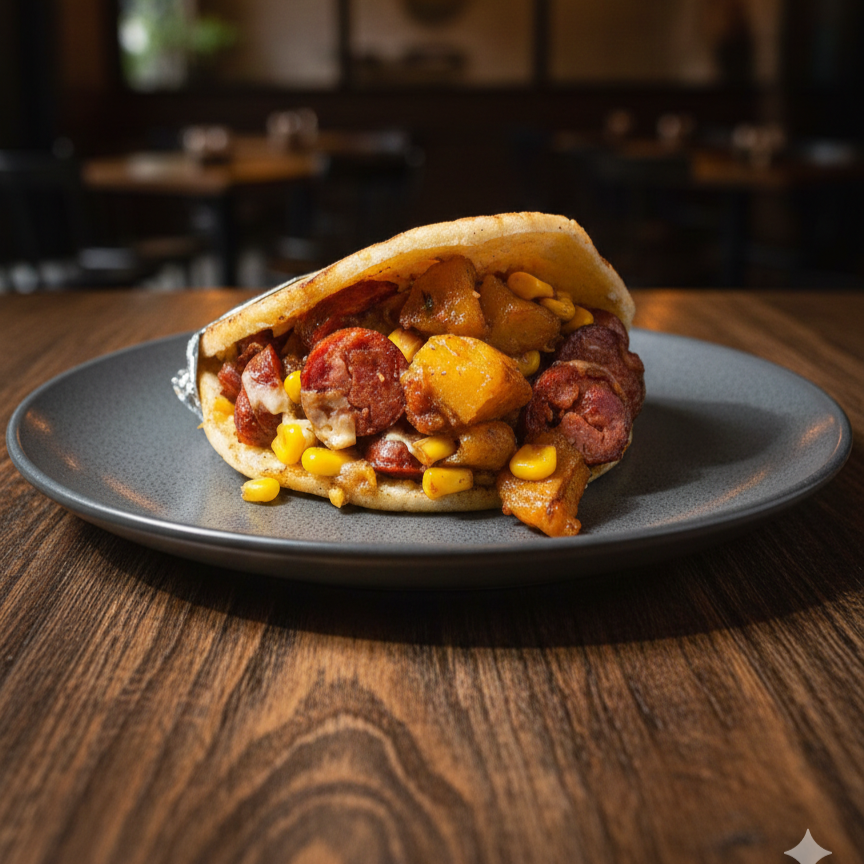 Arepa Rellena Colombiana acompañada de Chorizo Santarrosano, maíz, maduro y queso.