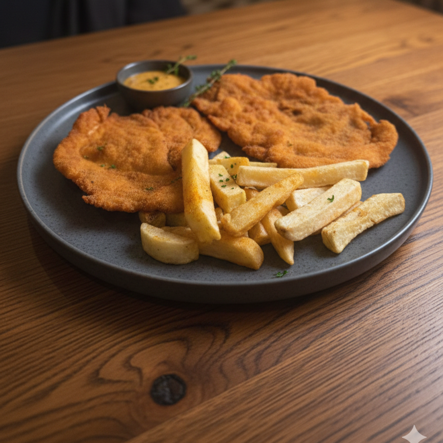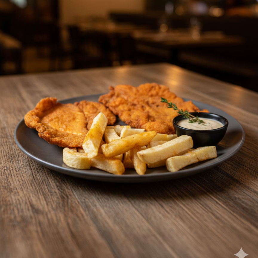 Chuleta de pollo o cerdo 300 gr Acompañado: Papas a la francesa, Maduro gratinado, Ensalada verde con aguacate, Bebida.