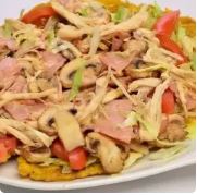 Pollo desmechado, jamon ahuimado en trocitos, champiñon, lechuga, tomate y nuestra deliciosa salsa de queso casera. Obsequio bebida y postre
