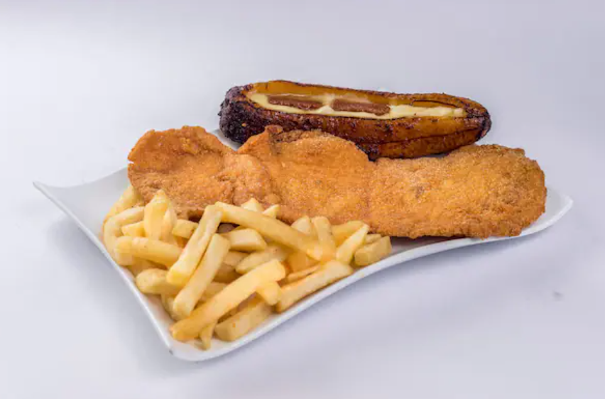 Chuleta de pollo o cerdo 120 gr, Acompañado: Papas a la francesa, Maduro Gratinado, Bebida jugo natural del dia.