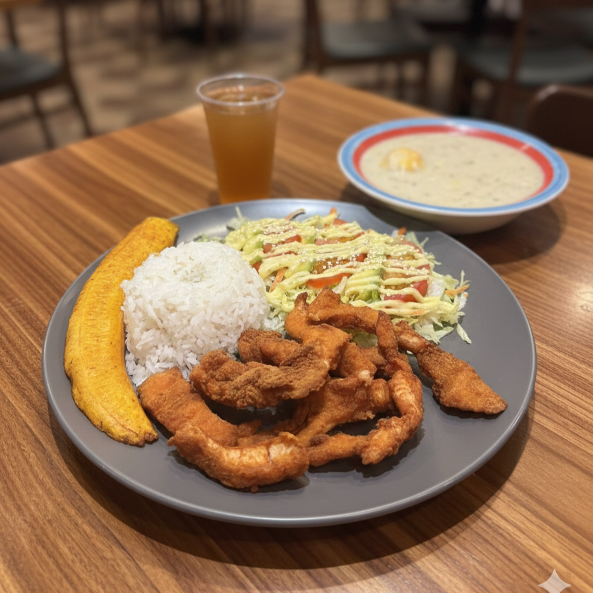 Delicioso Combo Chicken Tenders acompañado de arroz, tenders, ensalada, tajada, sopa del día y un delicioso jugo del día.