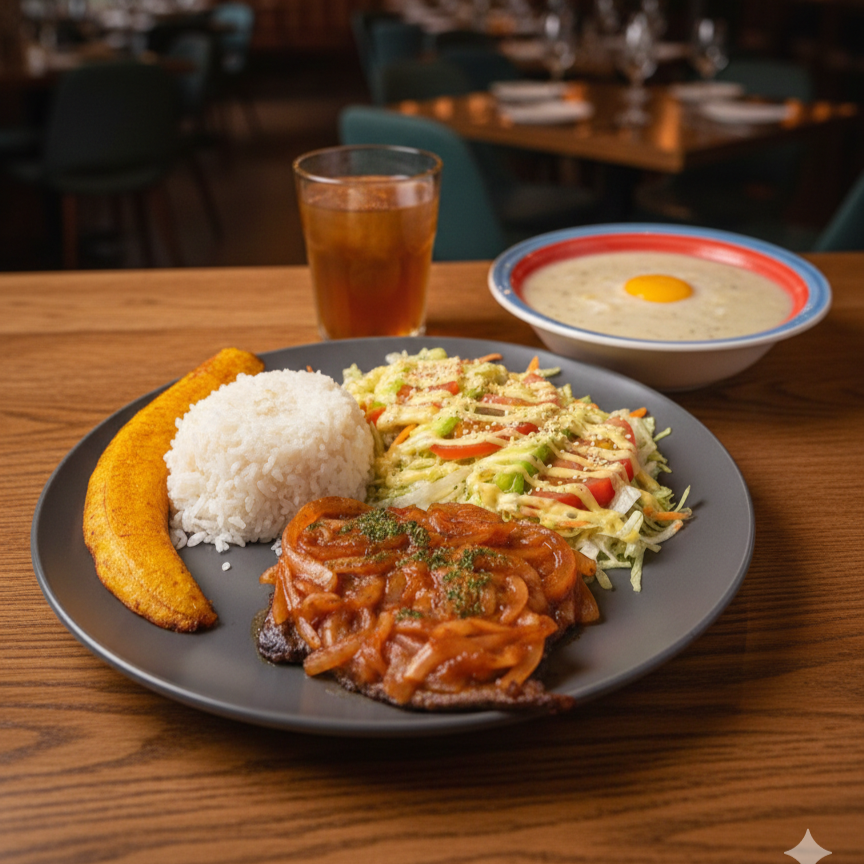 Delicioso Almuerzo Ejecutivo del Día acompañado con Hígado Encebollado, arroz, ensalada, tajada, sopa del día de 12 onz y una deliciosa bebida de la casa.