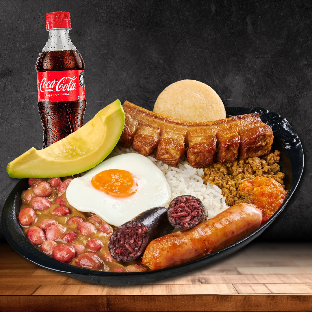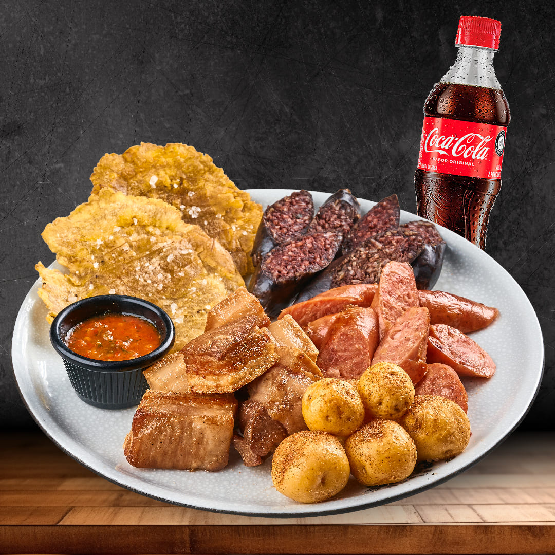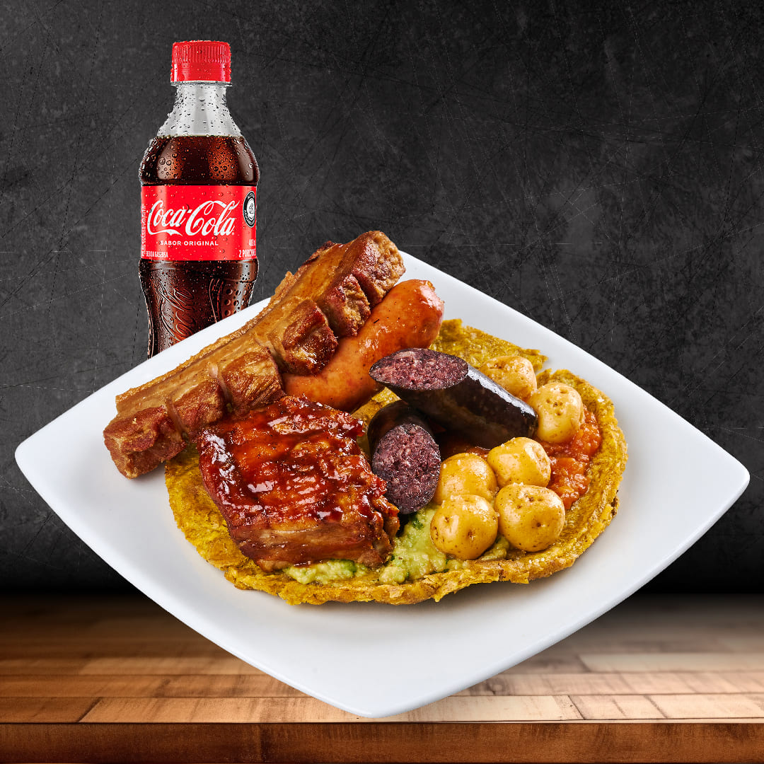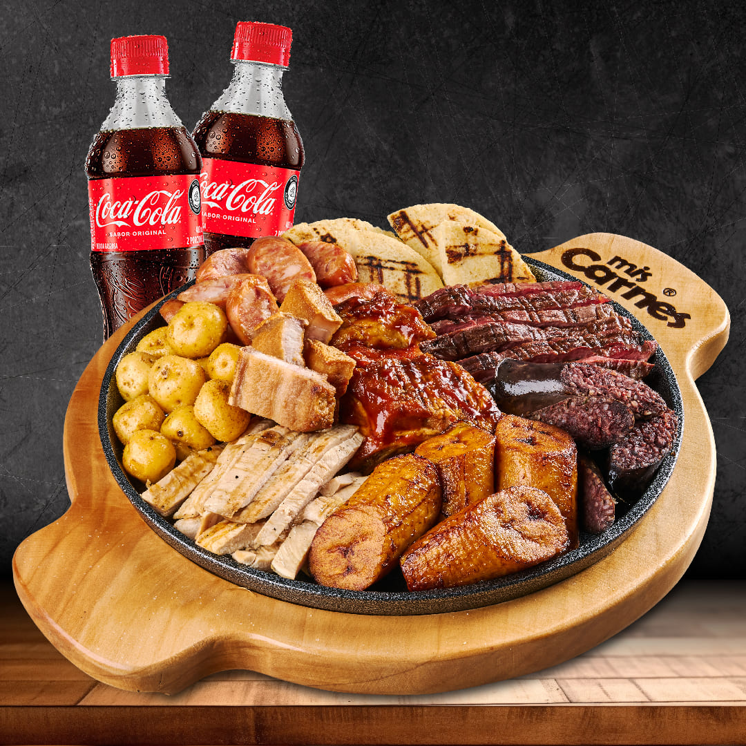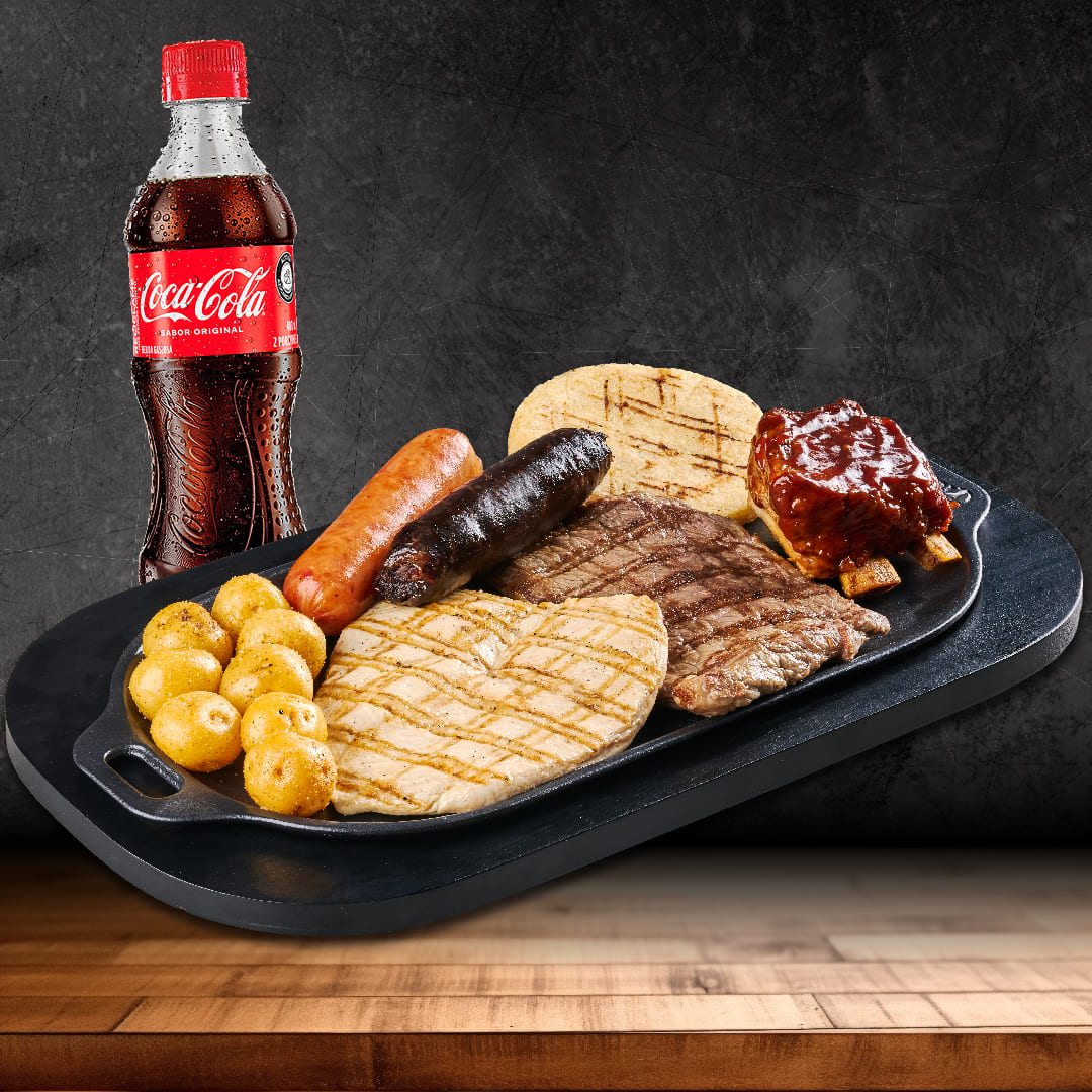 Carne de res, pechuga a la parrilla, costilla bbq, chicharrón, chorizo, morcilla, arepa de queso, plátano y papa criolla; con 2 coca cola 400ml.