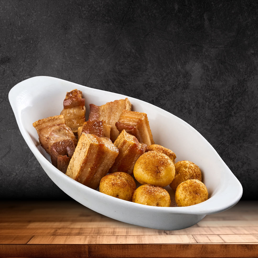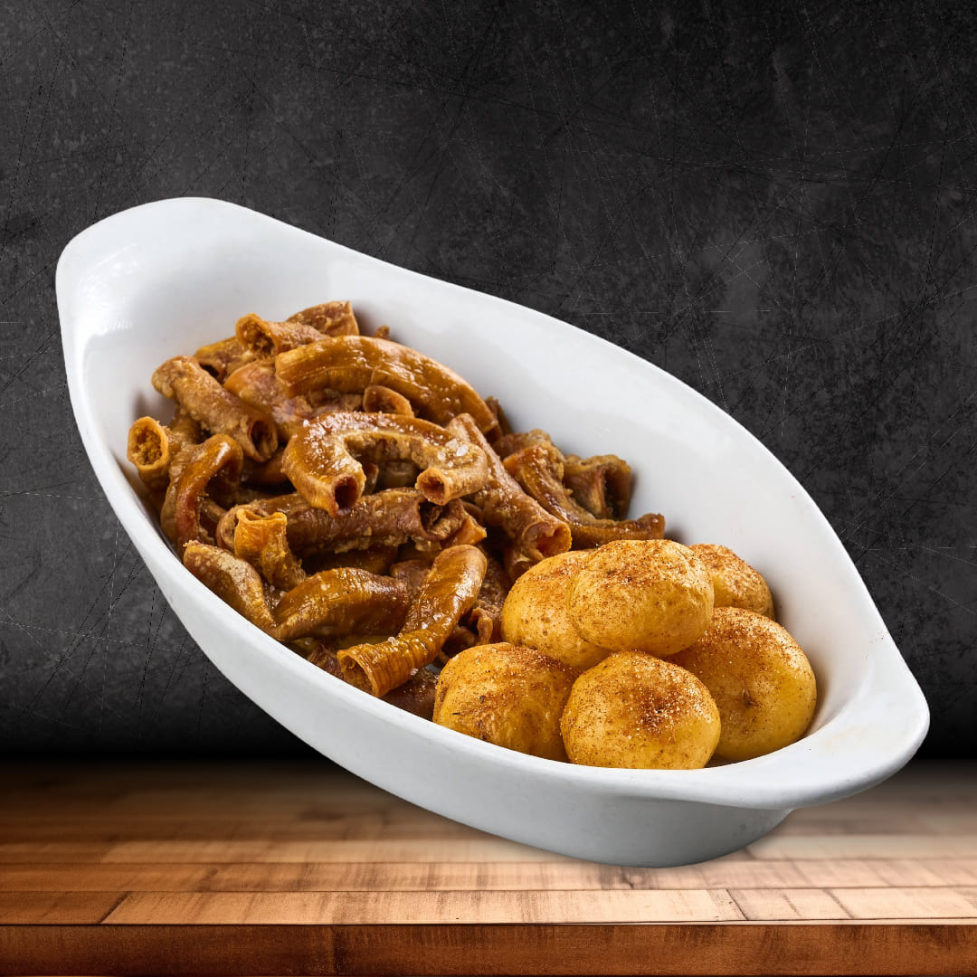 Dos deliciosas proteínas (Pechuga de pollo y Carne de Cerdo) acompañadas con papas a la francesa.
