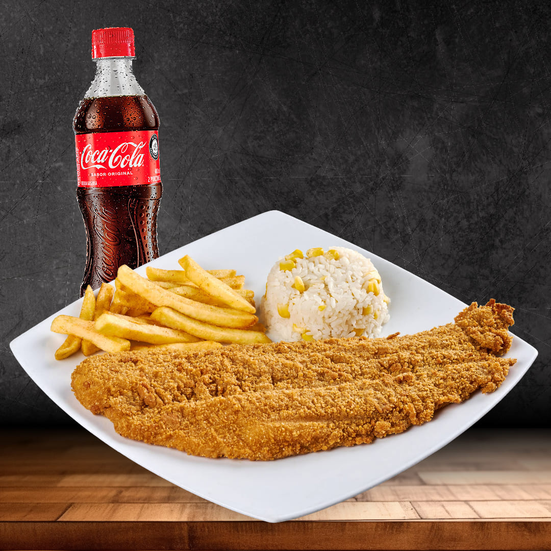Robalo apanado, Papas francesa, Salsa tártara del robalo en copa suflé, Coca Cola 400ml