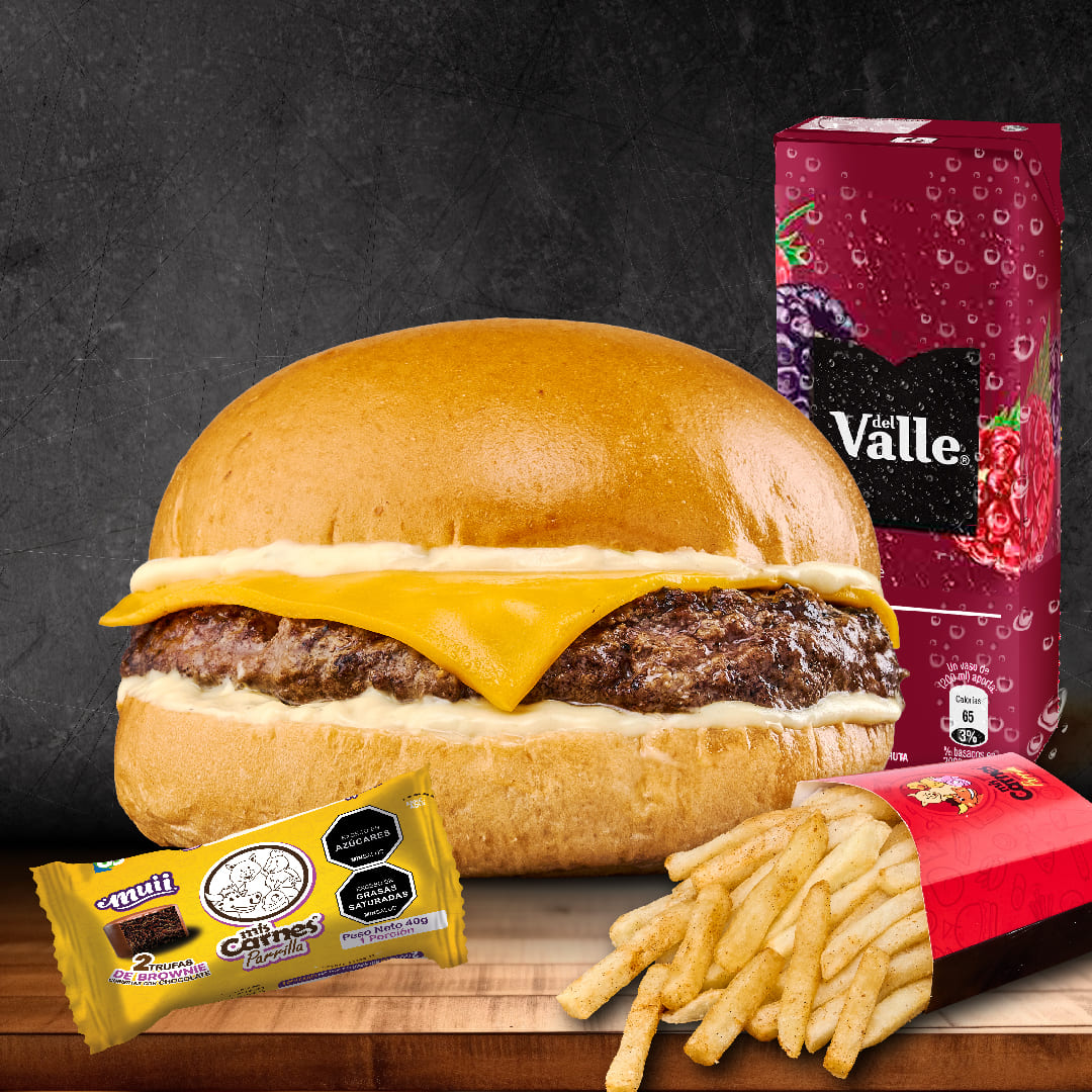 Hamburguesa sencilla o Nuggets de pollo con papas francesa, salsas, jugo del valle 200 ml y juguete de temporada.