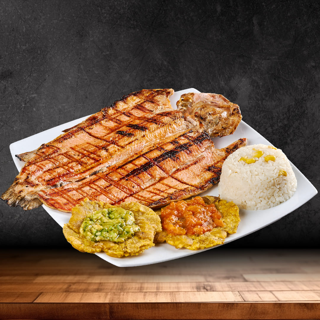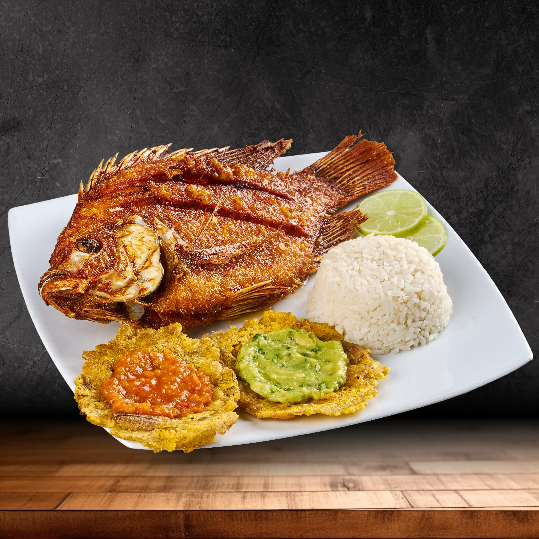 Mojarra frita con patacones (hogao y guacamole & arroz)