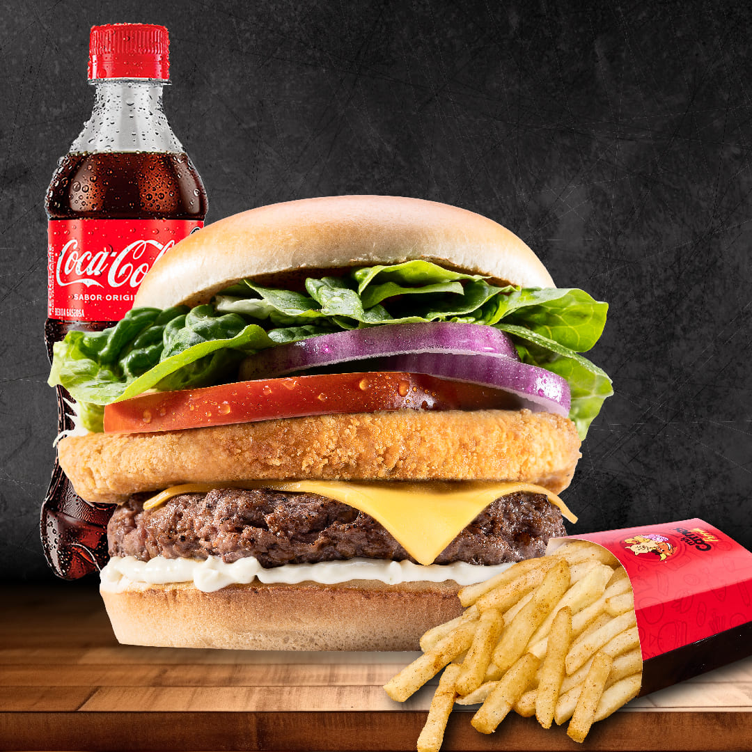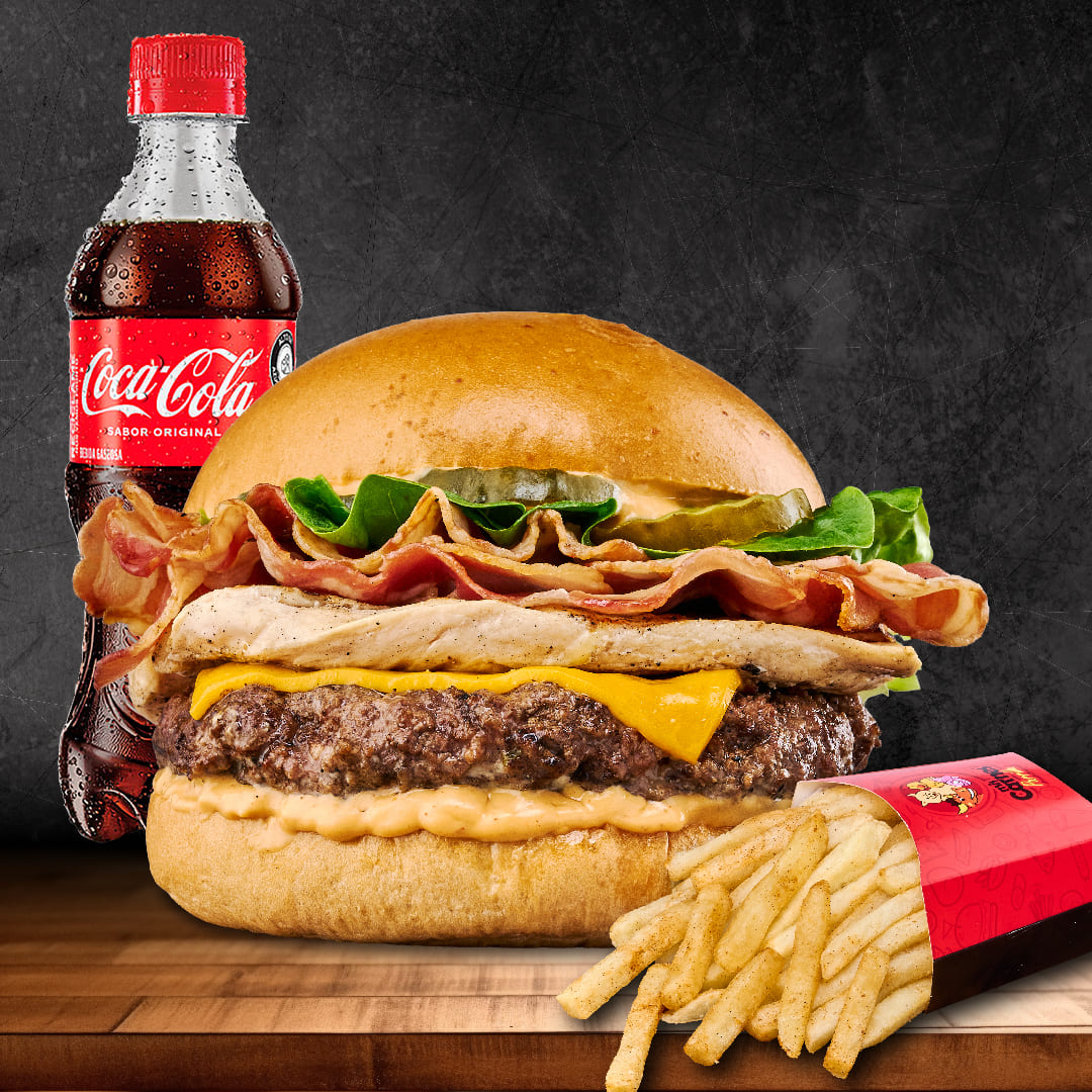 1/4 de libra pechuga, 1/4 de libra de res, pepinillos, queso cheddar, tocineta, lechuga con papas y Coca Cola 400ml.