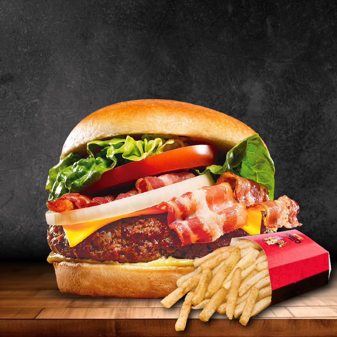 130 gr de carne angus, en un termino jugoso 3/4 acompañada de queso cheddar, lechuga y tocineta picada, con papas y bebida a elección