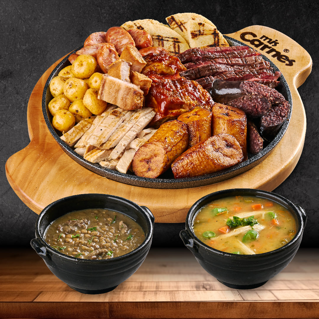 Carne de res, pechuga, costilla de cerdo bbq, morcilla, chorizo, arepa de queso, papa criolla, guacamole y Coca-Cola Original.