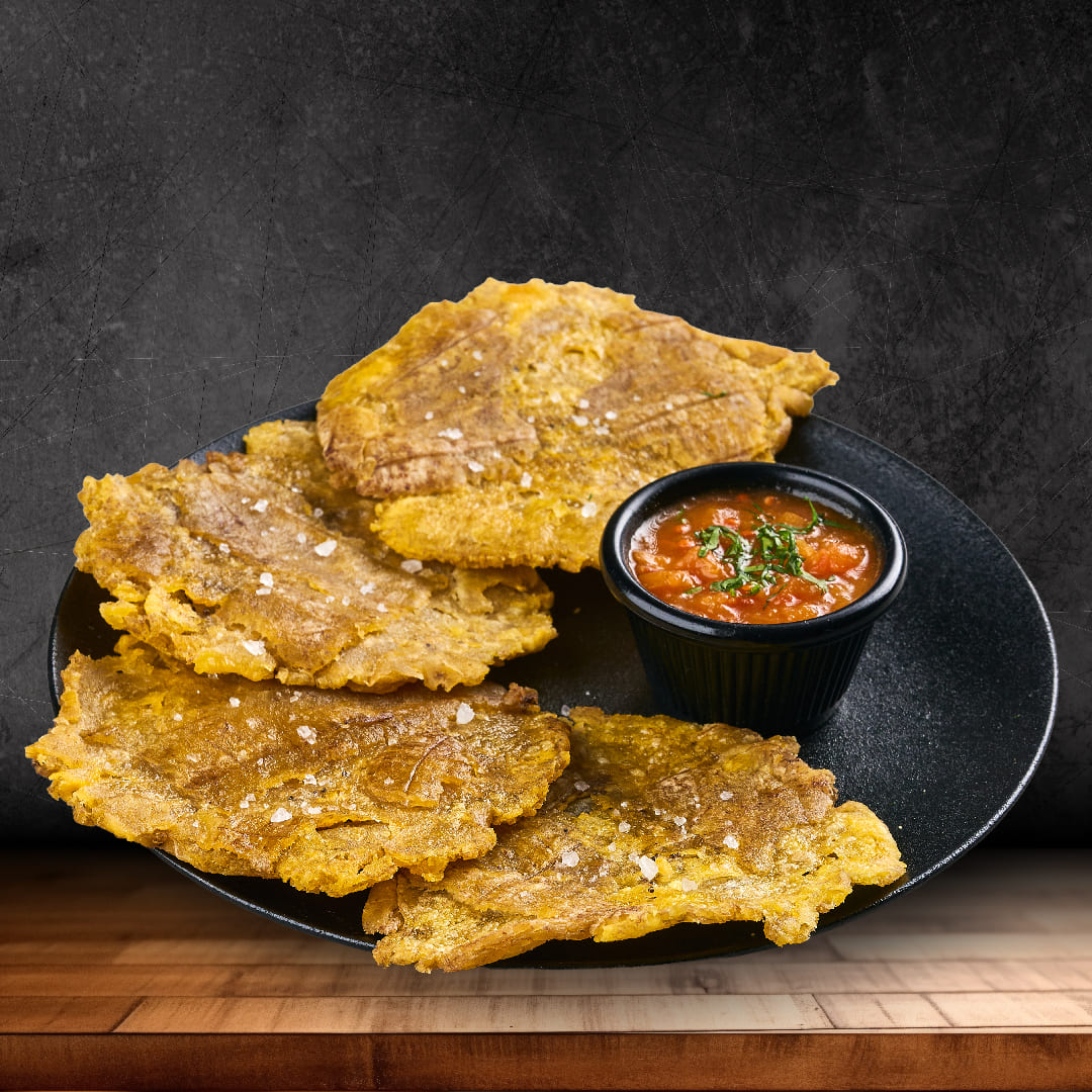 Patacón con hogao, arroz, aguacate, sopa de frijol & proteína a elección.