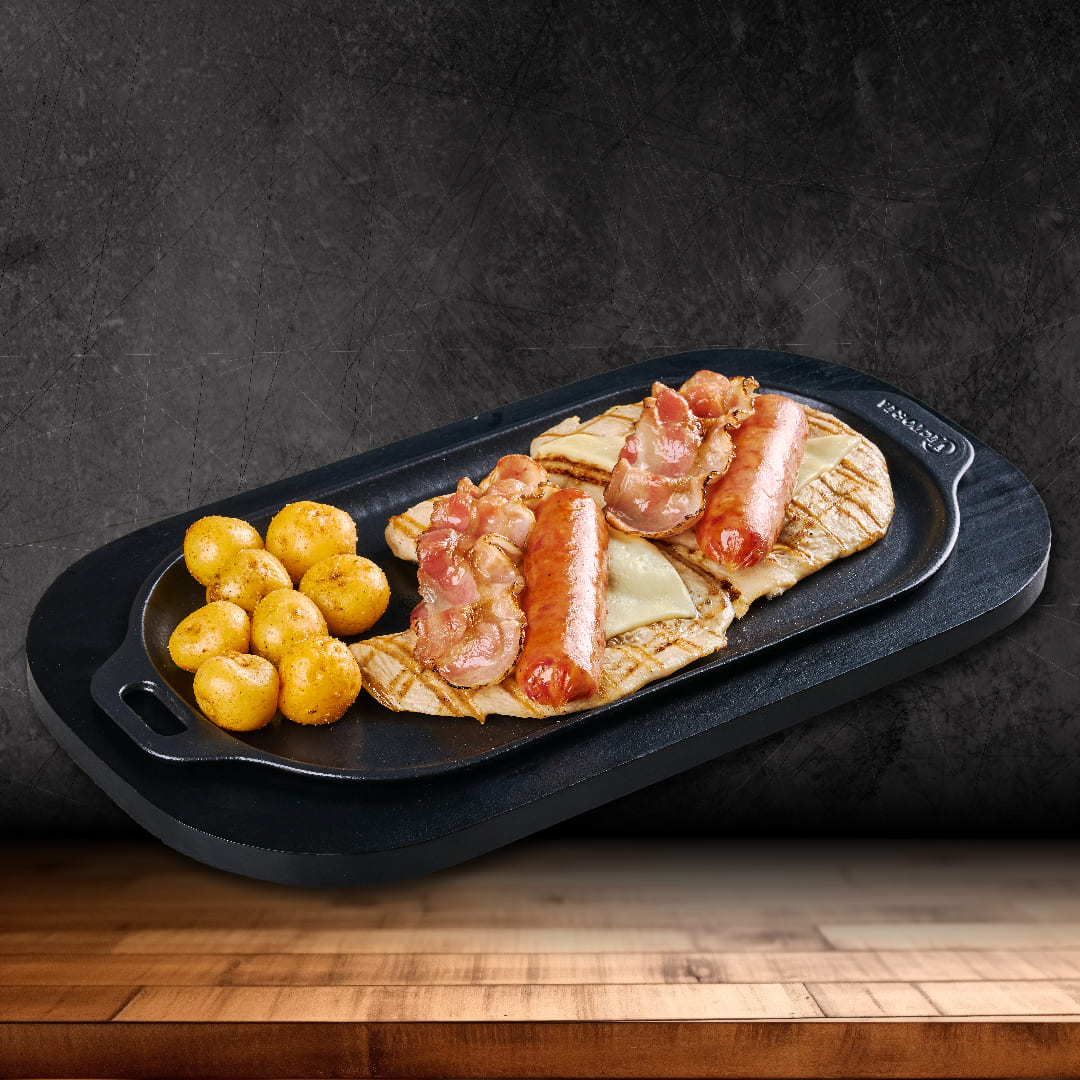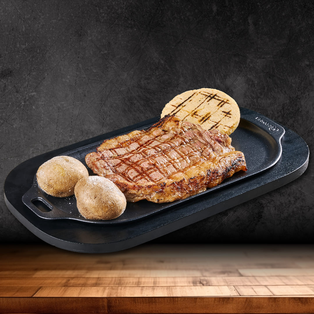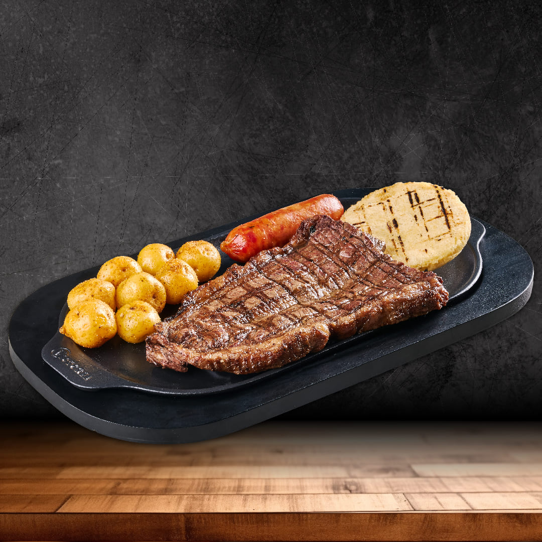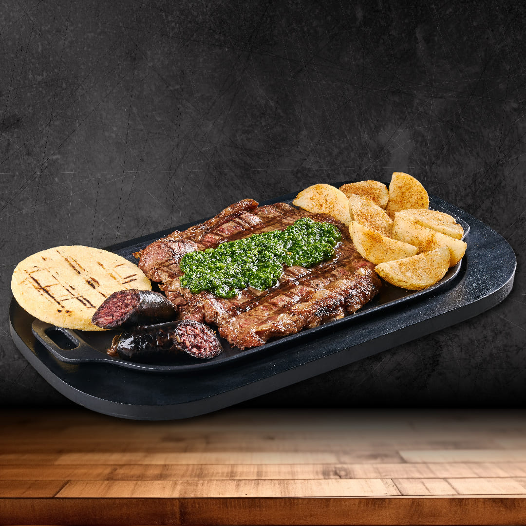 Carne de res, pechuga a la parrilla, costilla bbq, chicharrón, chorizo, morcilla, arepa de queso, plátano y papa criolla.