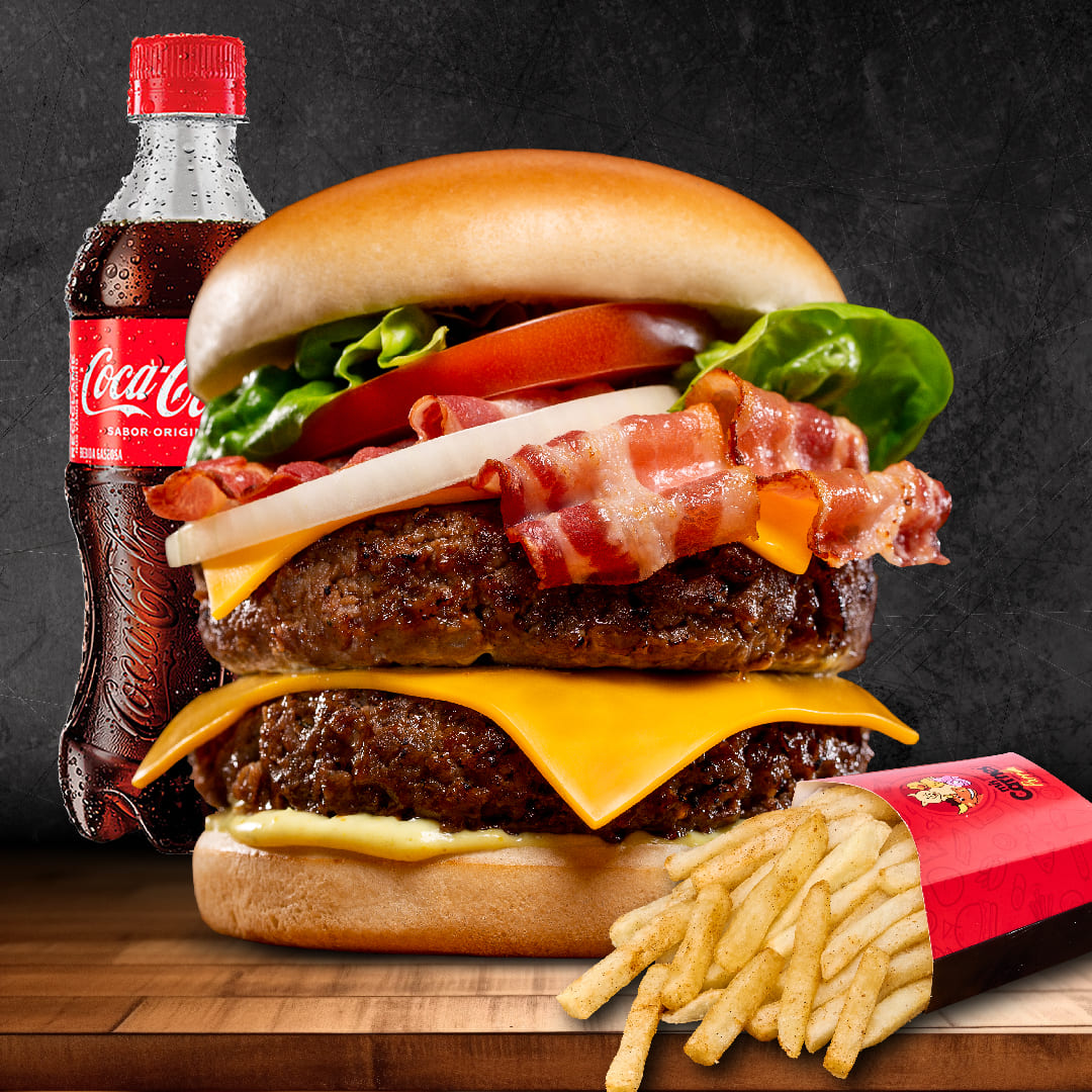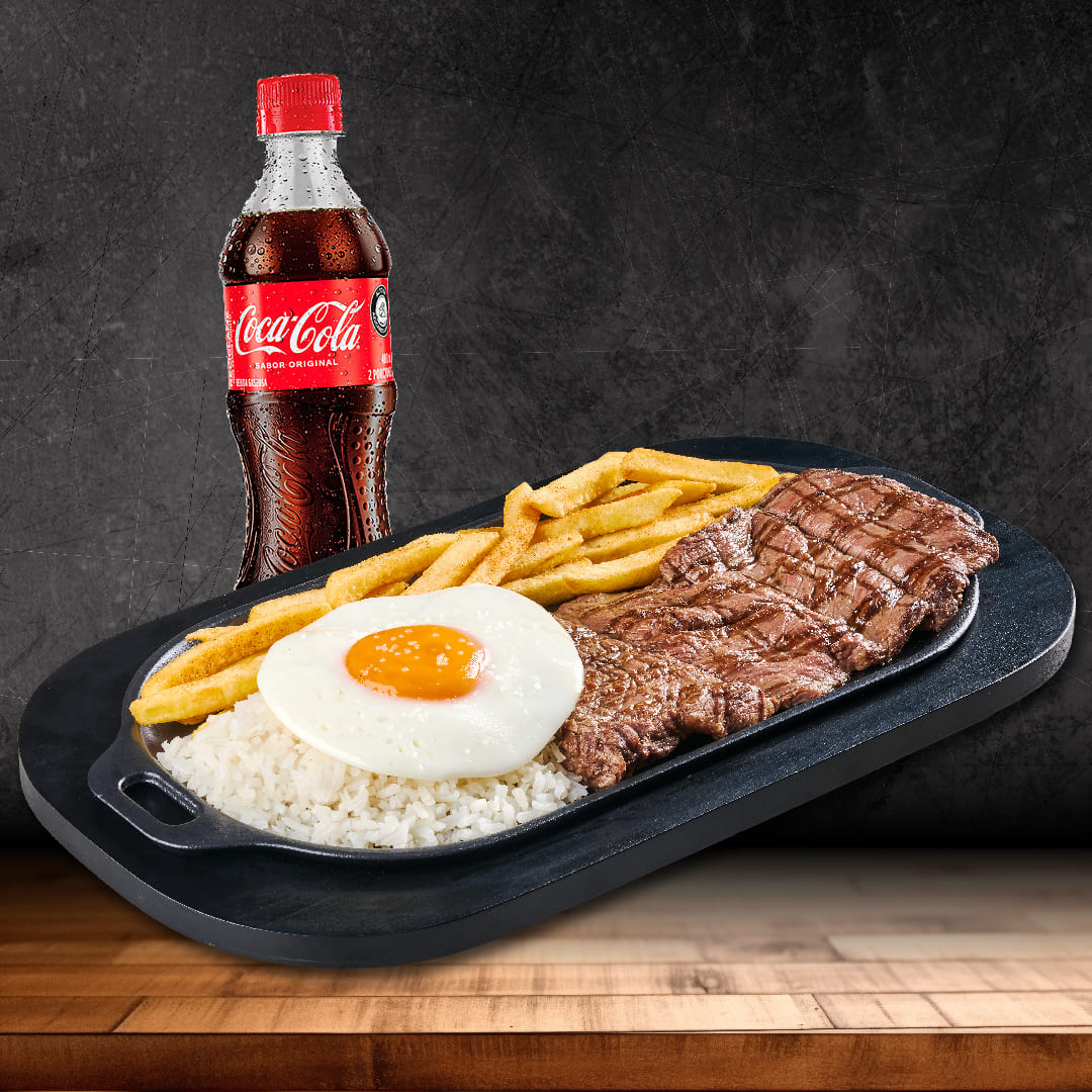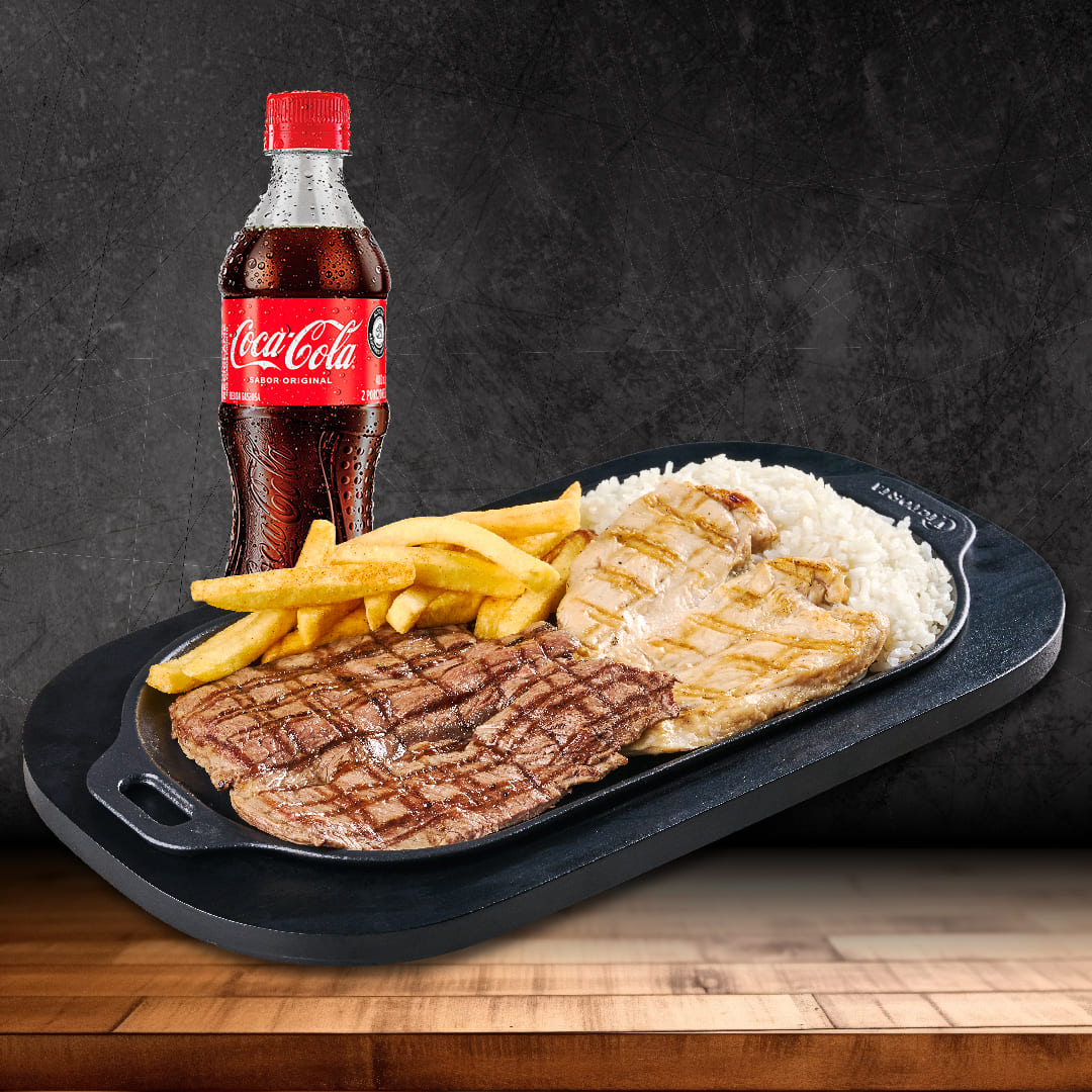 2 Porciones de carne, cada una de 125 gr aprox, queso mozzarella con guarnición a elección y coca cola original 400ml.
