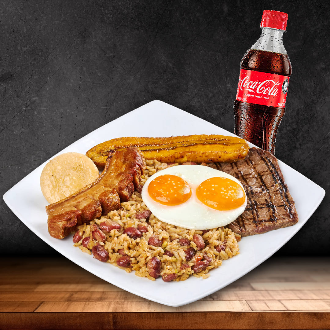 Frijoles con arroz, chicharrón, chorizo, huevo frito, tajadas de plátano y aguacate! Nosotros te regalamos la Coca Cola.