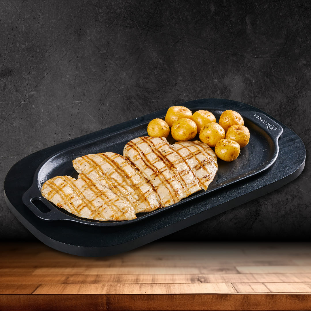 Base 250 gr de pechuga aprox, 250 gr aprox de carne acompañado de papa criolla y plátano maduro.