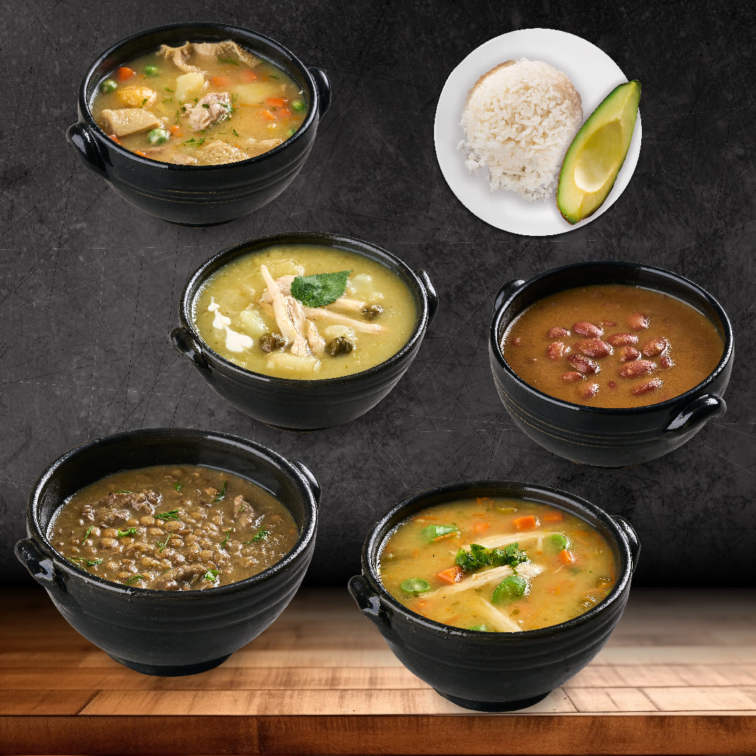 Elige tu Sopa personal (Ajiaco, Sopa de Verduras, Sopa de Frijol, o Sopa de Lenteja Favorita, y acompáñala con una deliciosa porción de arroz y Aguacate.
