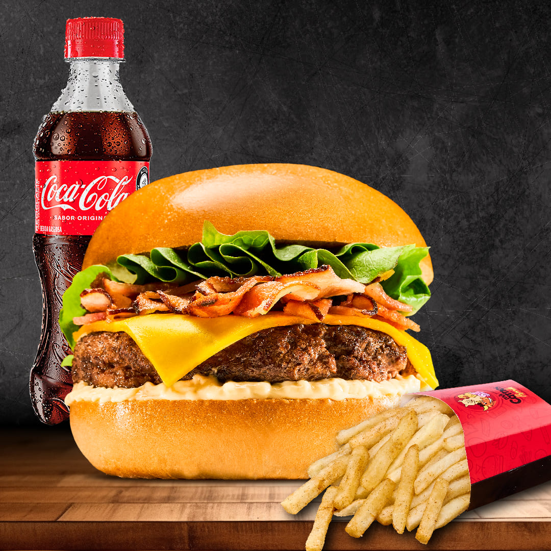 Cada porción de carne es de 130 gr, tomate, lechuga, queso cheddar, salsa, papas y Coca Cola Original 400ml.