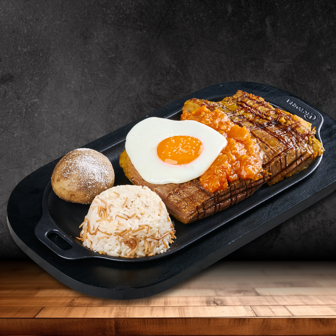 Acompañada de arroz con fideos, salsa grille, huevo frito, 1 papa salada & porción de aguacate.
