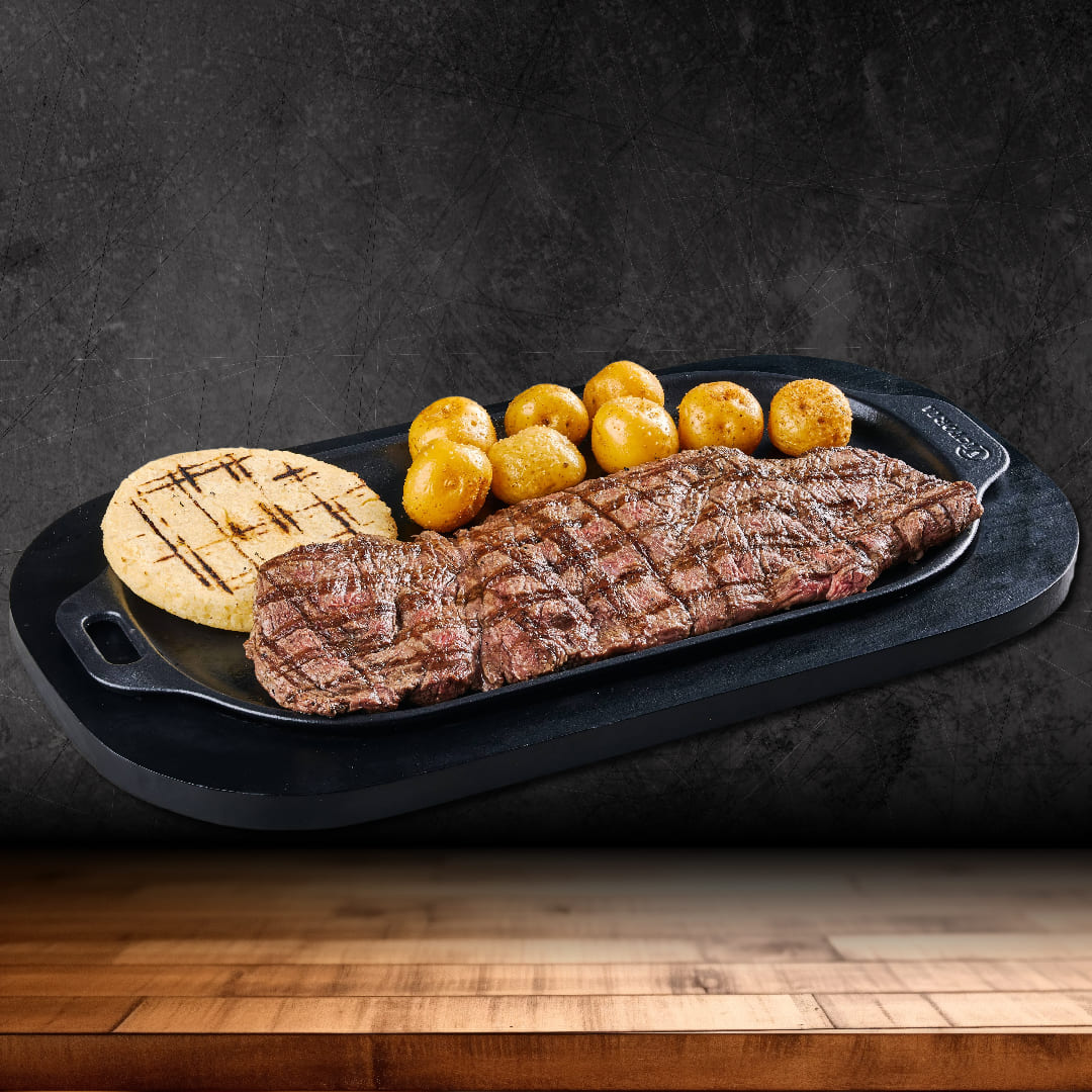 Punta de anca acompañada de arepa de queso, chorizo, papas criollas y ensalada de temporada.